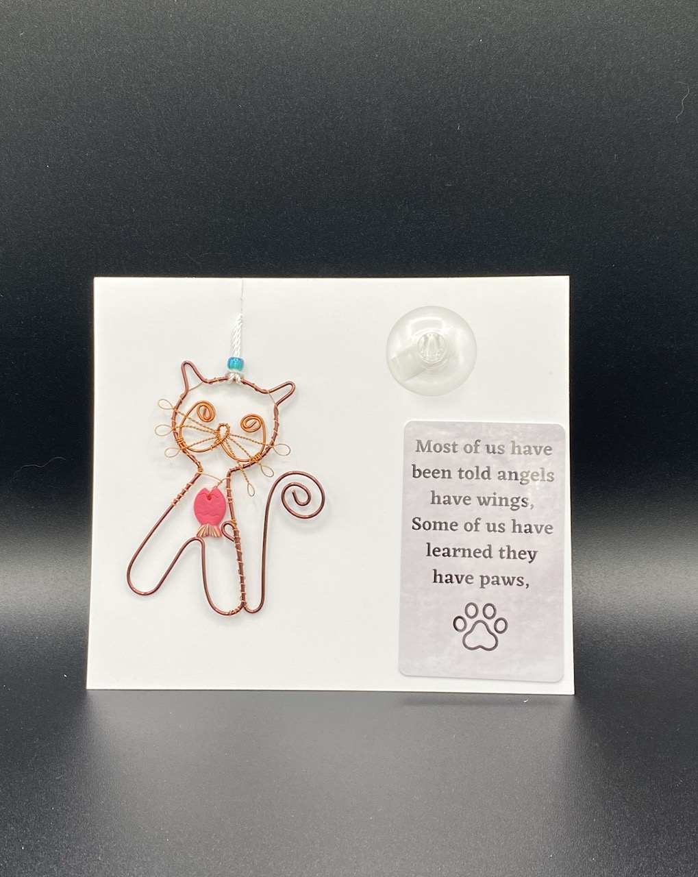 Who doesn’t love a cute little cat with crazy whiskers? Â Each one has a unique, handmade polymer fish collar and comes with one of two sentiment cards (Pets are Angels, Sociopath). Copper cat is approximately 4-1/2 – 5” in size, sentiment card is 3-1/2” x 2-1/4” in size. Comes with a suction cup for mounting on a window.