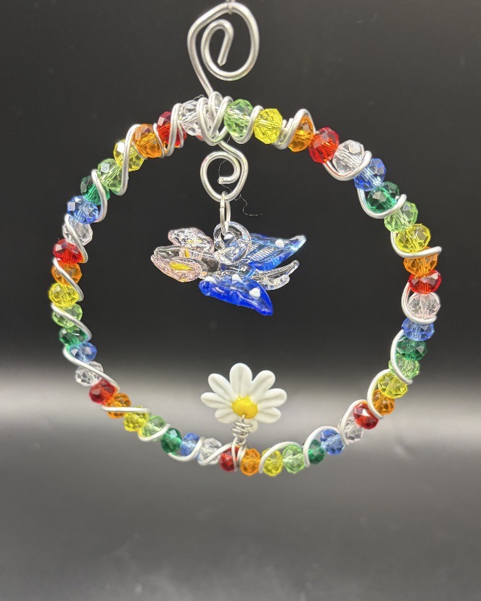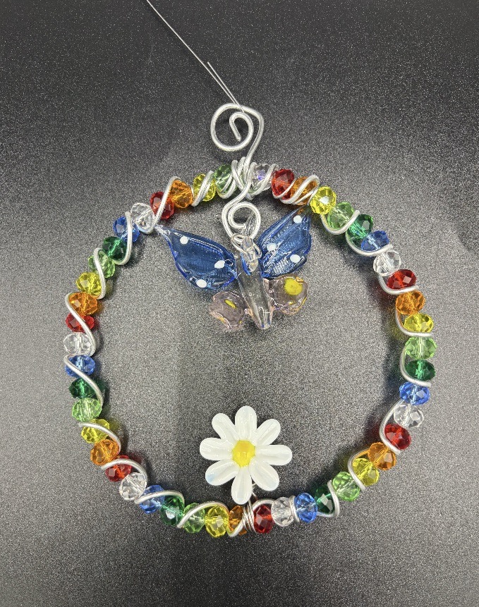 Hanging sun catcher – Aluminum glass beaded circle, glass butterfly