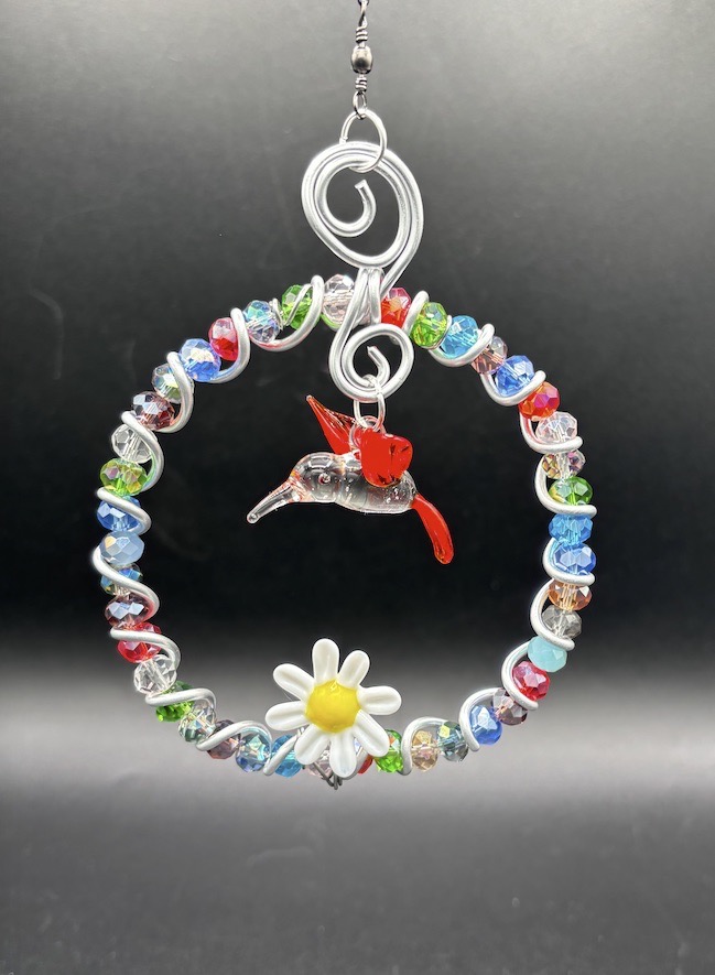 Hanging sun catcher, beaded glass circle with glass hummingbird and flower.