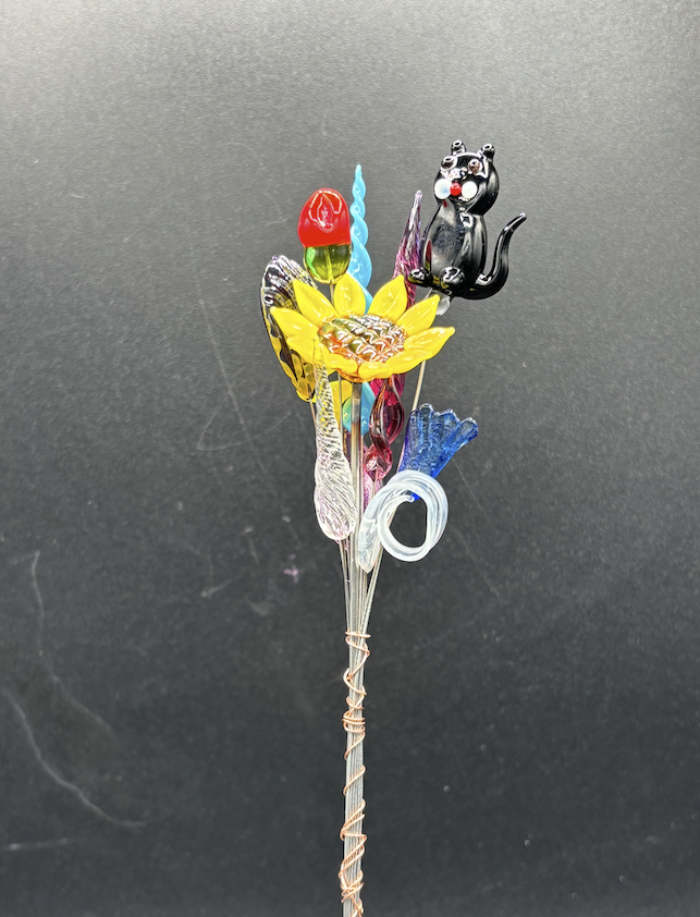 Large Glass Flower Bouquet – Glass flower, nine glass leaves, glass cat (multiple styles)