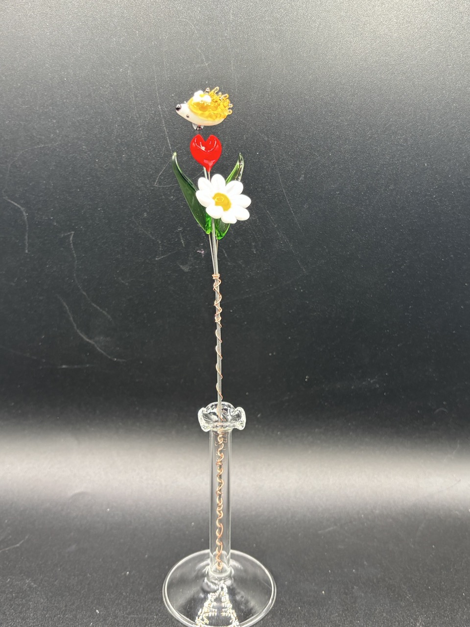 Small glass flower bouquet – Glass flower, two glass leaves, glass heart, glass hedgehog.