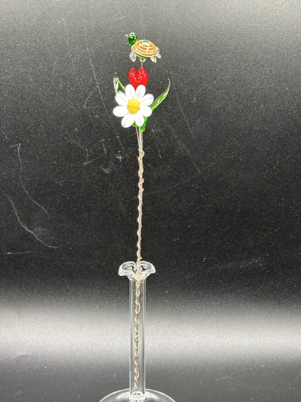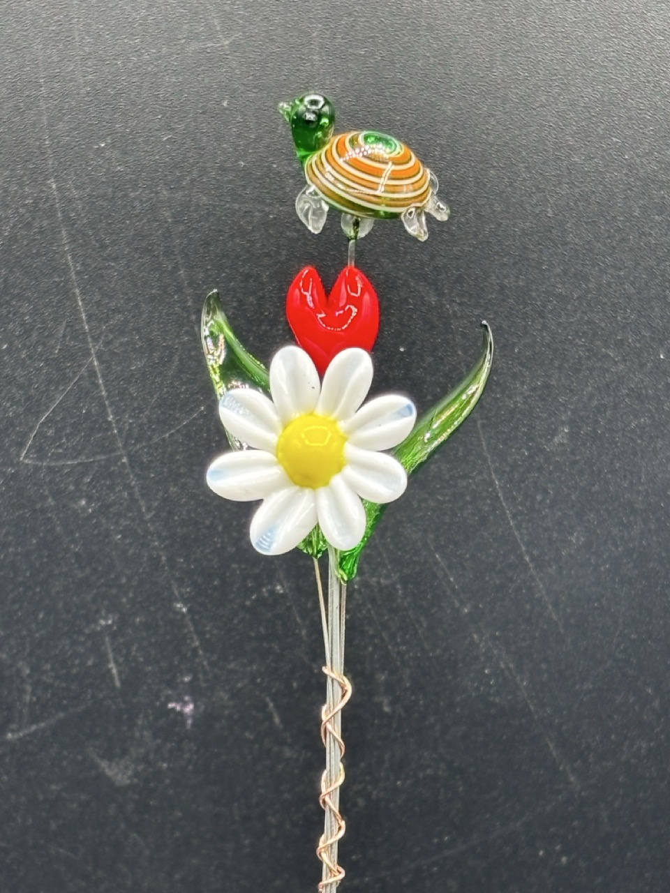 Small glass flower bouquet – Glass flower, two glass leaves, glass heart, glass turtle.