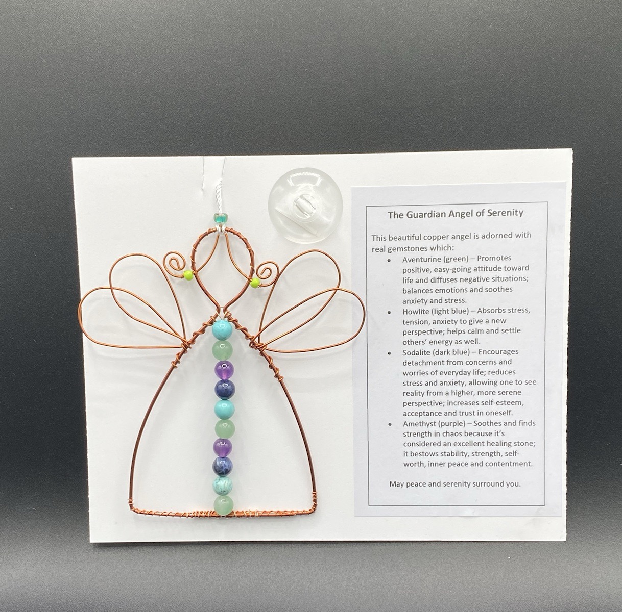 What a special gift this copper angel is! She is adorned with real gemstones that help guide, ground and bring peace. Angel is about 5-5 1/2” high and 4-4-1/2” wide. Comes with Angel of Serenity card, approximately 3-1/2” x 2-1/4” in size. Comes with a suction cup for mounting on a window.