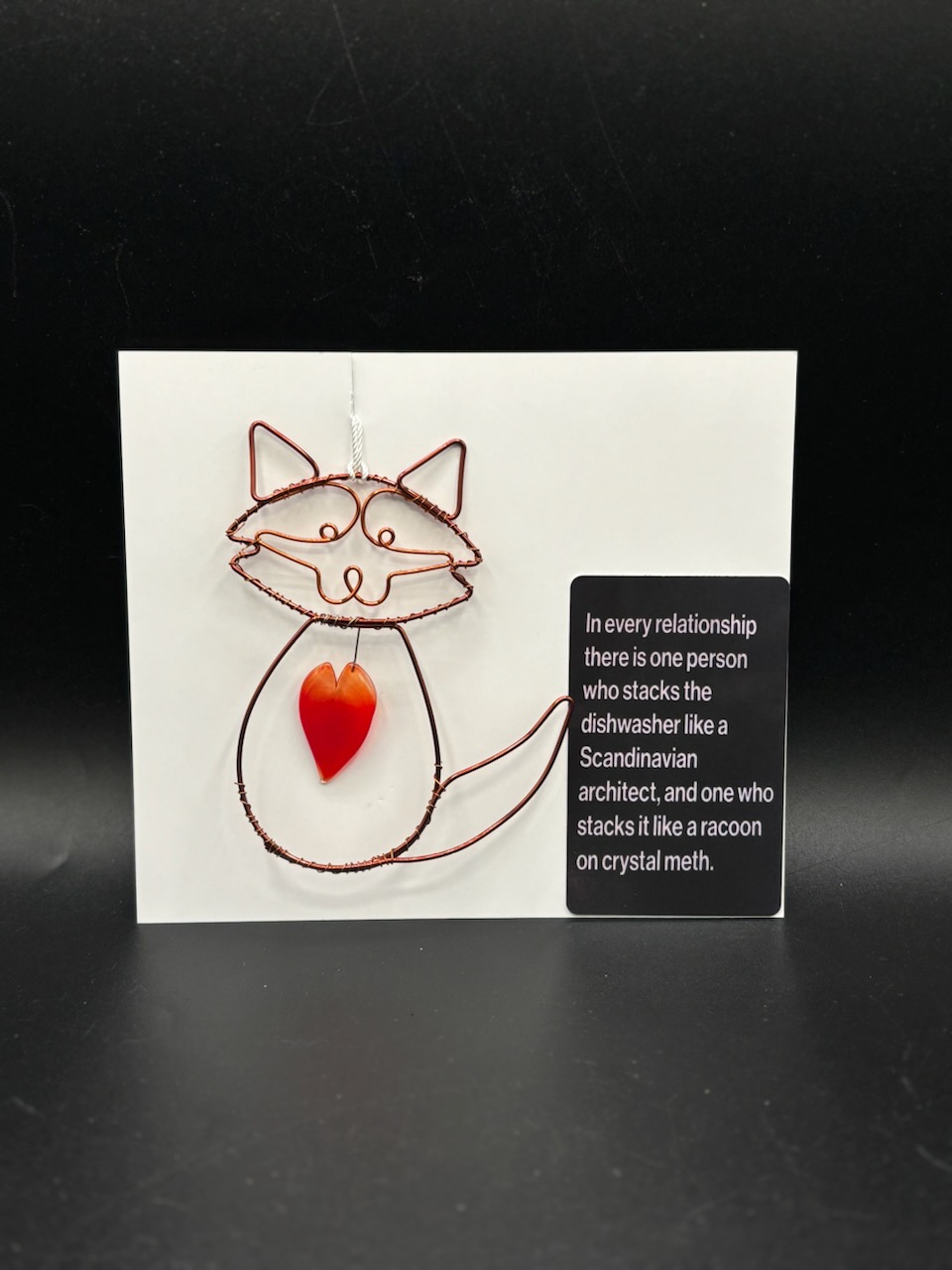 Our sun catchers are lovingly made by hand and make the perfect gift for all ages! In every couple, one is more Felix and the other more Oscar. Â This cute copper raccoon and glass heart reminds us to appreciate our differences. Copper raccoon, glass heart, sentiment card. Â Copper raccoon is approximately 4-1/2 – 5” in size, sentiment card is 3-1/2” x 2-1/4” in size. Comes with a suction cup for mounting on a window.
